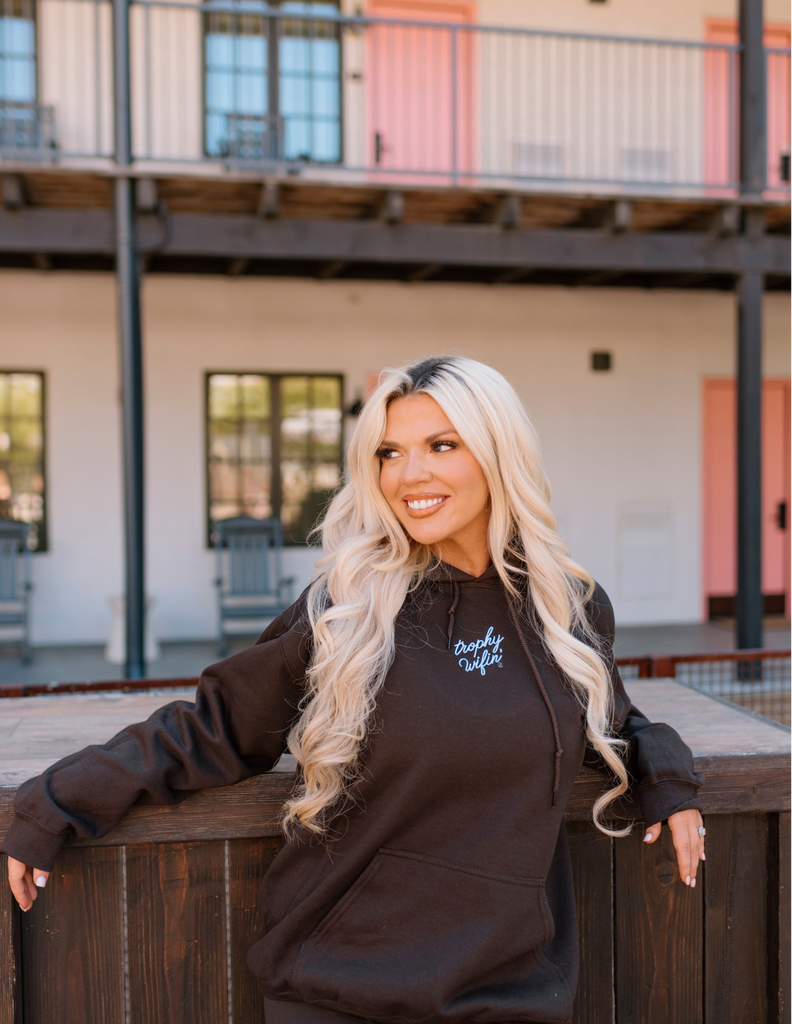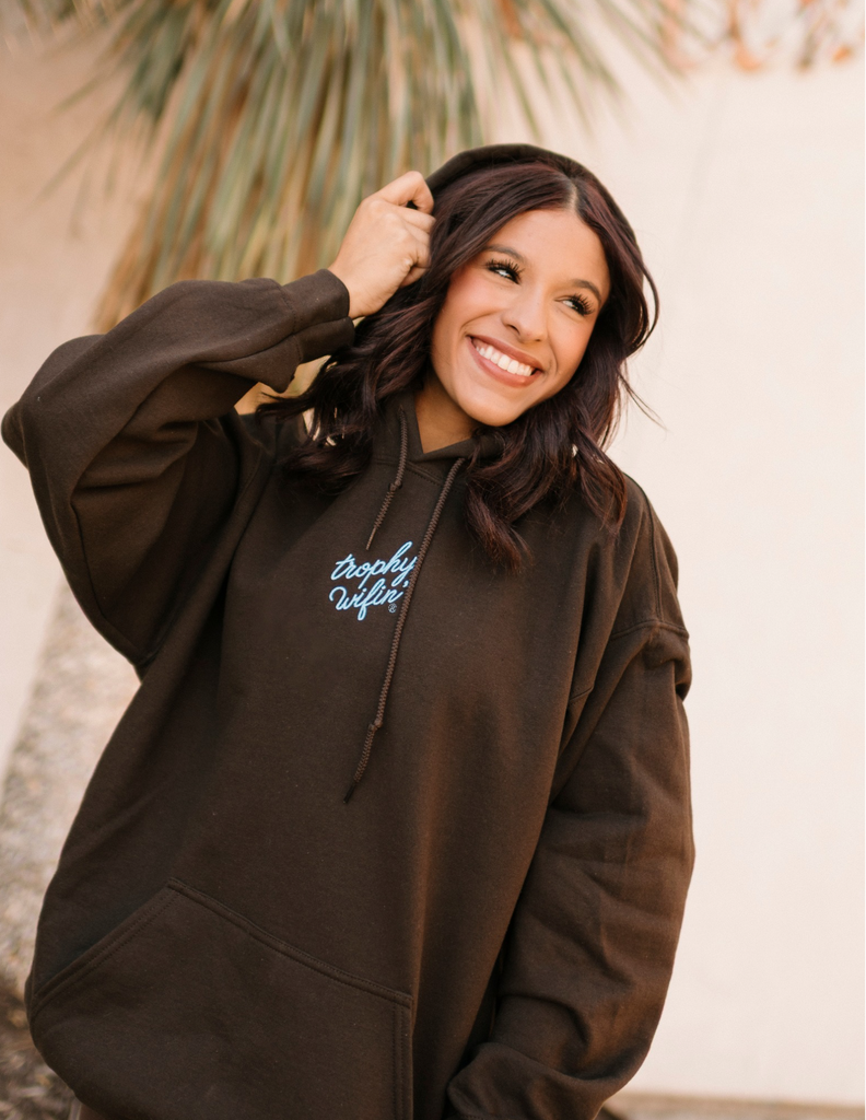 TROPHY WIFIN’®️ EMBROIDERED HOODIE- COFFEE COWGIRL BLUE/CHOCOLATE
