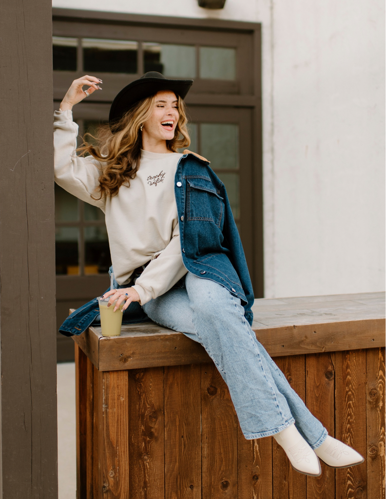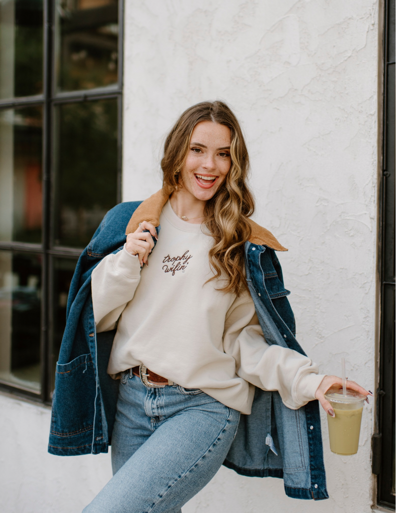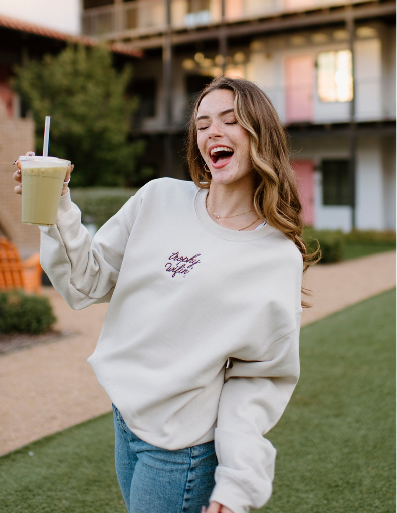 TROPHY WIFIN’®️ EMBROIDERED SWEATSHIRT- COFFEE COWGIRL CHOCOLATE/TAN