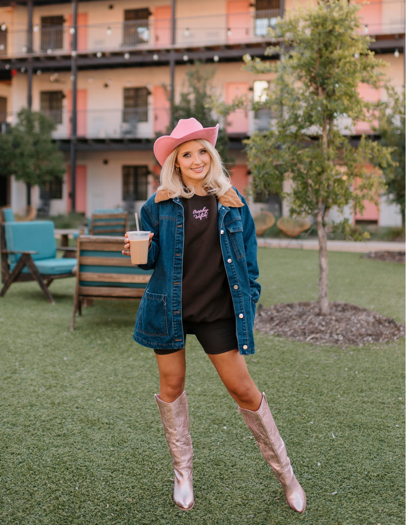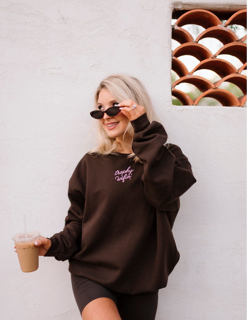 TROPHY WIFIN’®️ EMBROIDERED SWEATSHIRT- COFFEE COWGIRL PINK/CHOCOLATE